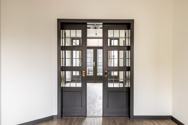 Toegang tot de ruime en lichte kamer-en-suite, met de woonkamer aan de voorzijde. Deze is middels originele en-suite deuren met glas-in-lood af te sluiten.