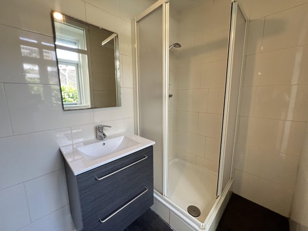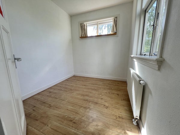 De keuken is functioneel ingericht en voorzien van een gas kookplaat, afzuigkap, koel-vriescombinatie en voldoende opbergruimte. Via de keuken en hal bereik je de badkamer, uitgerust met een wastafel met kastruimte, een douchecabine en een aansluiting voor wasmachine en droger. Achterin de woning bevindt zich de slaapkamer, met genoeg ruimte voor een tweepersoonsbed en een kledingkast. Vanuit hier heb je zicht op de tuin, wat zorgt voor een rustige en ontspannen sfeer.