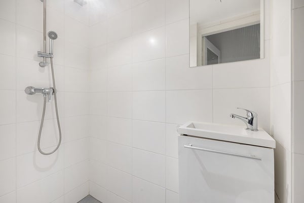 Aan de voorzijde bevindt zich een slaapkamer, ideaal als werkkamer of logeerkamer. Vanuit de hal bereik je de badkamer met inloopdouche en wastafelmeubel, modern uitgevoerd in neutrale tinten.