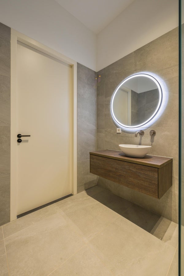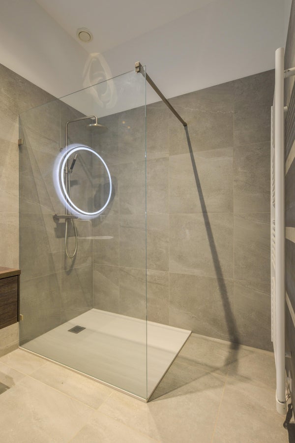 - Luxe sanitair in het aparte toilet en de badkamer, zoals een modern badkamermeubel, regendouche, handdoekradiator en spiegel met verlichting