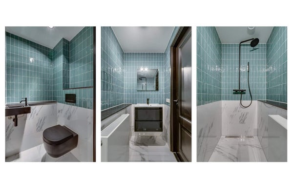 Keuken en sanitair: De luxe open keuken is uitgerust met moderne inbouwapparatuur en biedt voldoende kastruimte, ideaal voor liefhebbers van koken en gezellige avonden thuis. De badkamer en het aparte toilet zijn voorzien van hoogwaardige materialen, waaronder marmeren en blauwe tegeltjes, wat een moderne en frisse uitstraling geeft aan deze ruimtes.