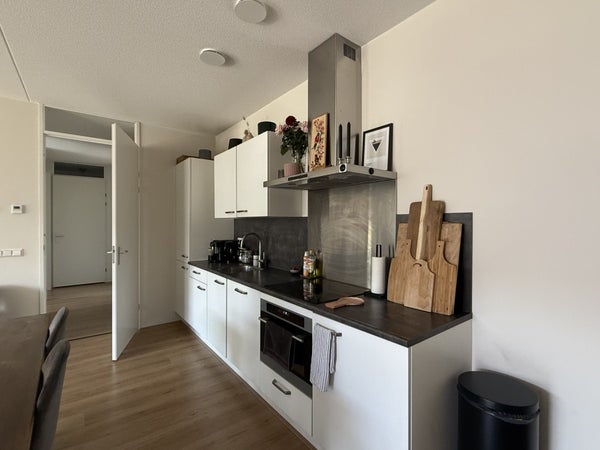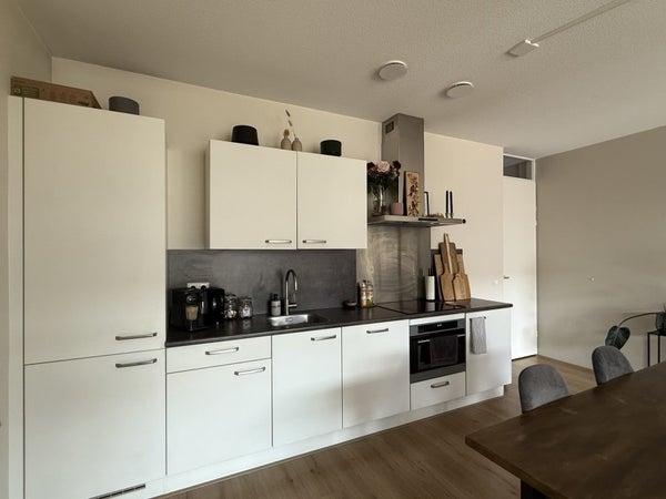 De moderne, witte keuken is voorzien van een koel-vriescombinatie, oven met magnetronfunctie, inductiekookplaat en vaatwasser. De badkamer heeft een inloopdouche, een dubbele wastafel met spiegel en zwevend toilet. Er is daarnaast een apart toilet met fontein. Vanuit de lichte woonkamer stap je zo het ruime balkon op. Daarnaast is er een grote berging binnen het appartement.