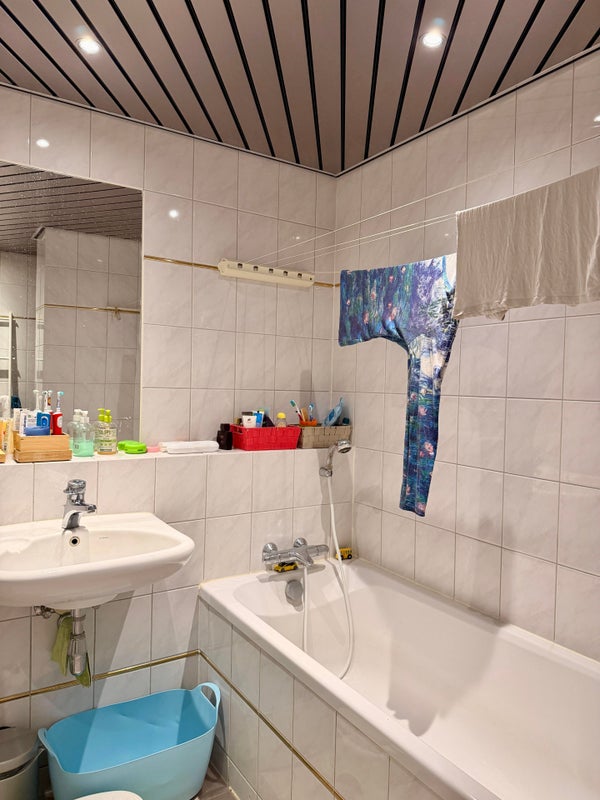 - Badkamer (5,5 m²): voorzien van ligbad met douche en wastafel.