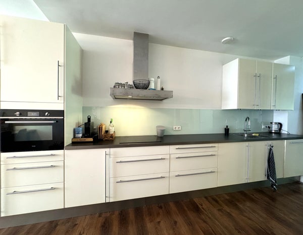 Vanuit de entreehal kom je in de hal van het appartement, waar zich een toilet bevindt. De hal leidt naar de open keuken en de ruime woonkamer met eetgedeelte en zithoek. Grote ramen zorgen voor veel lichtinval. Via een groot schuifraam heb je toegang tot het riante balkon.