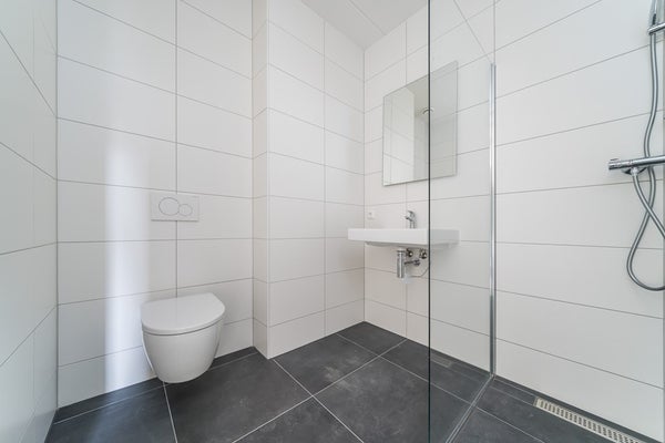 De badkamer is voorzien van keramische tegels in de kleur antraciet, wastafel met bijpassend planchet, douche, toilet en een spiegel.