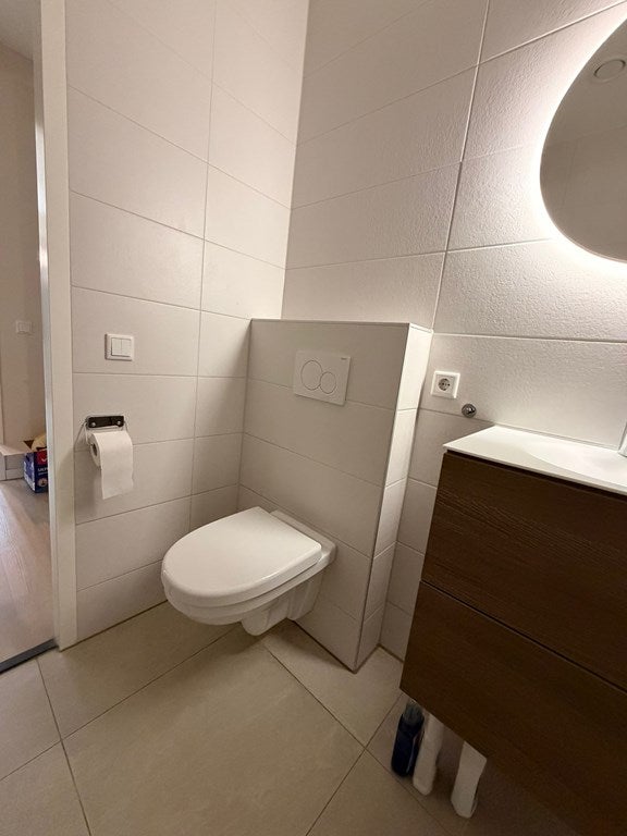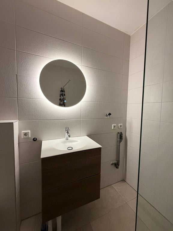 De badkamer is geheel betegeld en ingericht met douche, inbouwreservoir en wastafel.