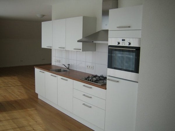 - Open keuken (wit met houtkleurig bovenblad) met divers apparatuur; gaskookplaat, koelkast, combi-magnetron en vaatwasser
