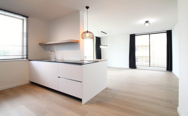 Royale woonkamer met veel natuurlijke lichtinval en een open keuken. De ruime beschikt over een PVC vloer met onderliggend vloerverwarming, en tevens zal er nog voor raamdecoratie gezorgd worden. Vanuit de woonkamer is het balkon te bereiken van ca. 6m2.