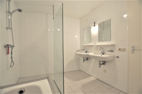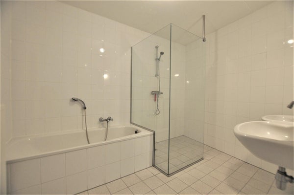 Badkamer met ligbad, aparte doucheruimte en twee vaste wastafels.