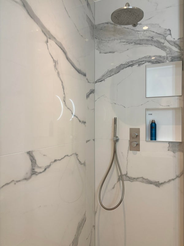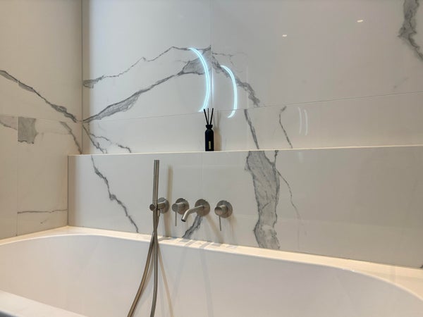De luxe, volledig betegelde badkamer is voorzien van een ligbad, een dubbele wastafel met meubel, een inloopdouche en een radiator, wat zorgt voor een comfortabele en stijlvolle ruimte.