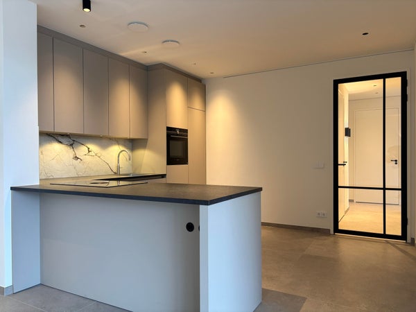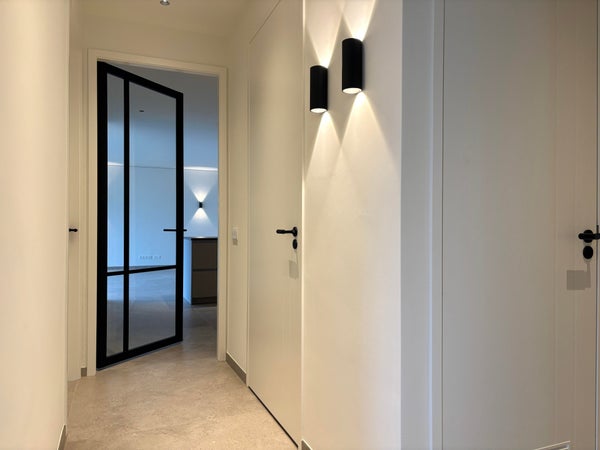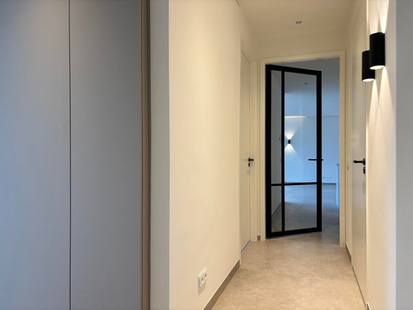 Twee ruime slaapkamers met hoge plafonds en stijlvolle afwerking bieden volop comfort, waarbij één slaapkamer directe toegang heeft tot het balkon.