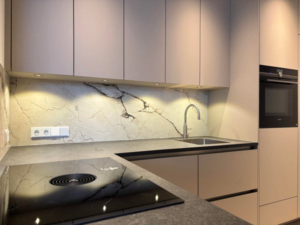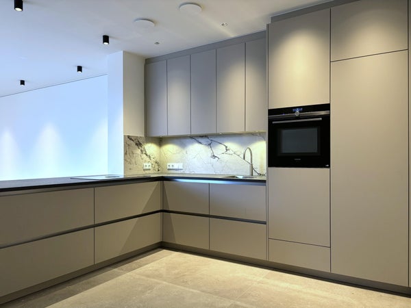 De luxe open keuken is voorzien van hoogwaardige apparatuur, waaronder een vaatwasser, oven, Bora inductiekookplaat met afzuiging en een koel-vriescombinatie.