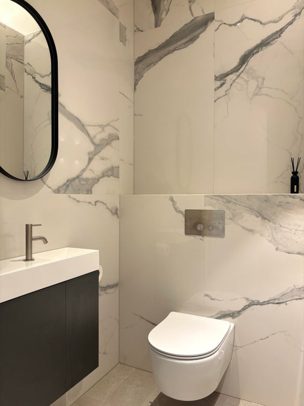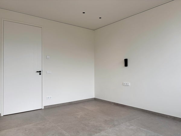 De entree biedt directe toegang tot het deels betegelde toilet, voorzien van een wastafel en een stijlvolle afwerking. Daarnaast is er een praktische berging met aansluitingen voor de wasmachine, vloerverwarming, WTW-unit en het ventilatiesysteem, wat bijdraagt aan een nette en functionele indeling. Vanuit de entree leidt een directe doorgang naar de woonkamer, waardoor een vloeiende en praktische overgang tussen de ruimtes ontstaat.