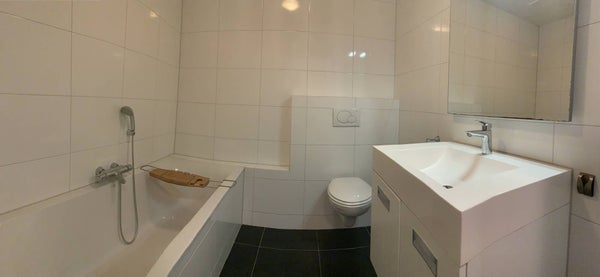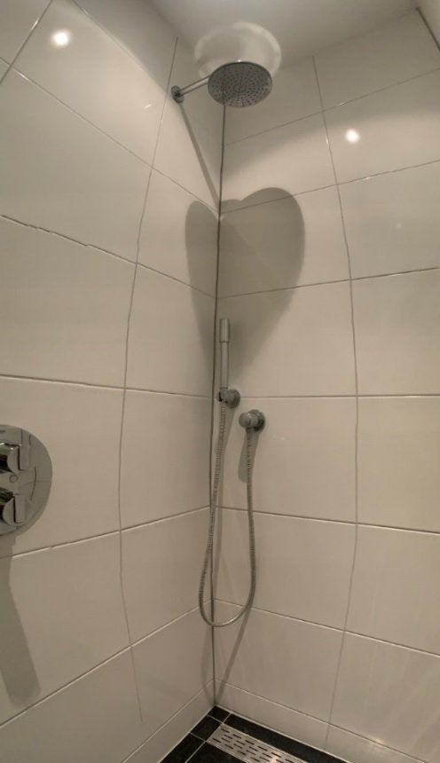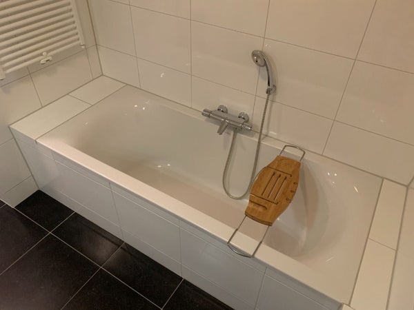 Luxe badkamer is voorzien van aparte douche met regendouche en extra handdouche voorzien van thermostraatkraan en riant ligbad eveneens voorzien van thermostaatkraan.