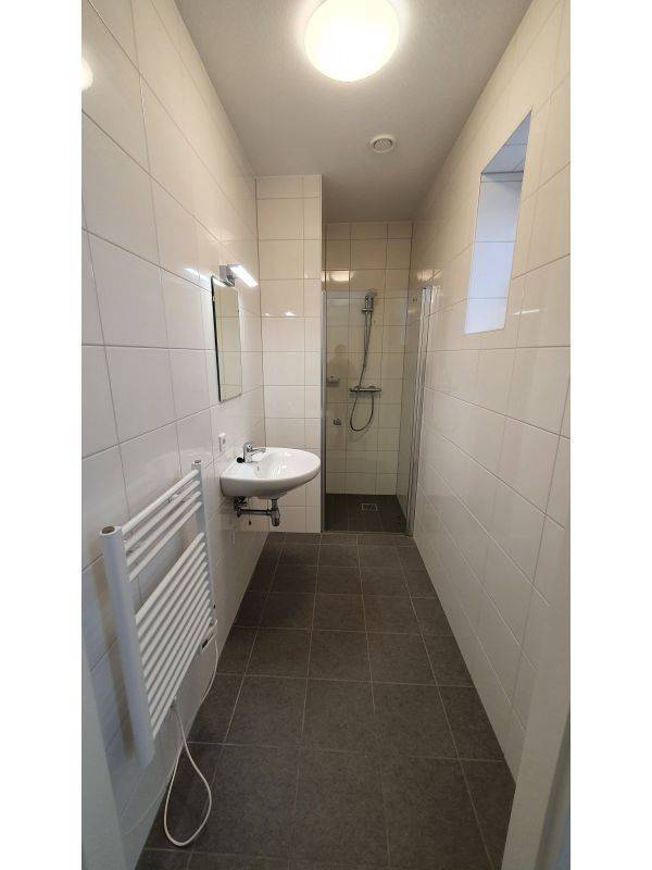 - Toilet en badkamer zijn tot bovenaan afgewerkt met tegels en voorzien van een inloopdouche met douchewand