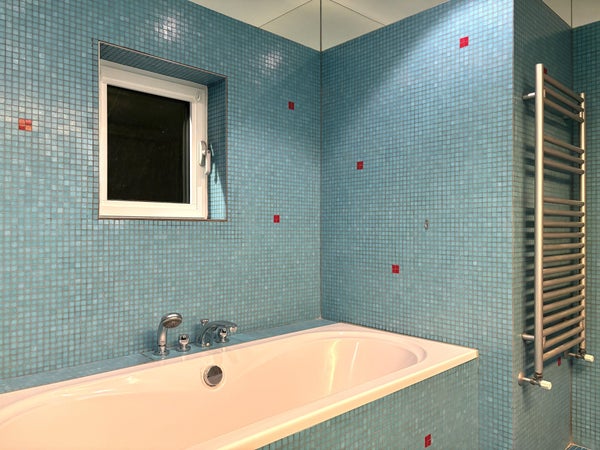 Zeer ruime badkamer met een dubbele wasbak, toilet, ligbad en inloopdouche.