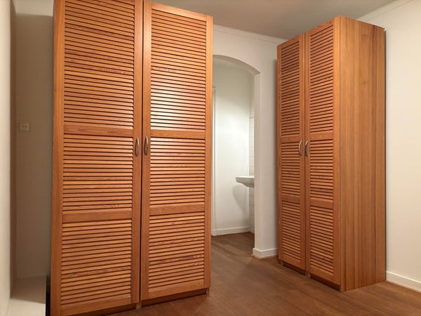 Twee ruime slaapkamers met inbouwkasten en wastafel.