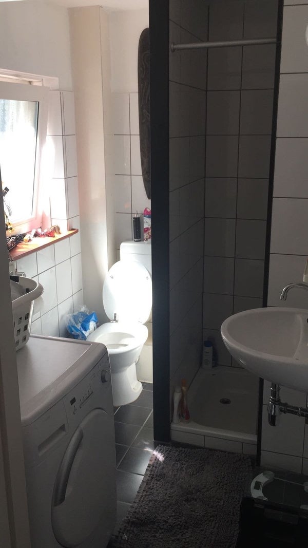 Keurige badkamer met douche, toilet, aansluiting voor de wasmachine en wastafel.