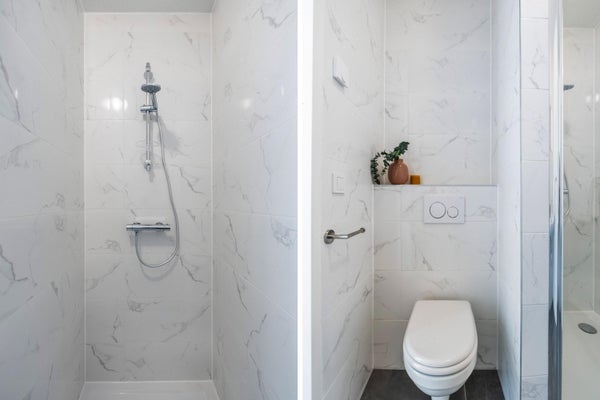 De slaapkamer biedt plek aan een comfortabel bed en kledingkast. De badkamer is modern afgewerkt met douche, wastafel, spiegel, toilet, handdoekradiator en stijlvolle tegels in neutrale tinten.