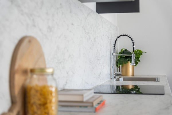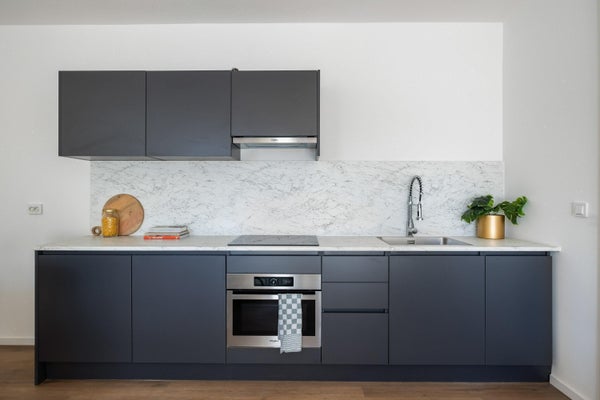De woonkamer is sfeervol ingericht met moderne meubels en een ronde eettafel. De open keuken is voorzien van een donkergrijs front met marmerlook aanrechtblad en beschikt over een inductiekookplaat, vaatwasser, grote koelkast en combi-oven.