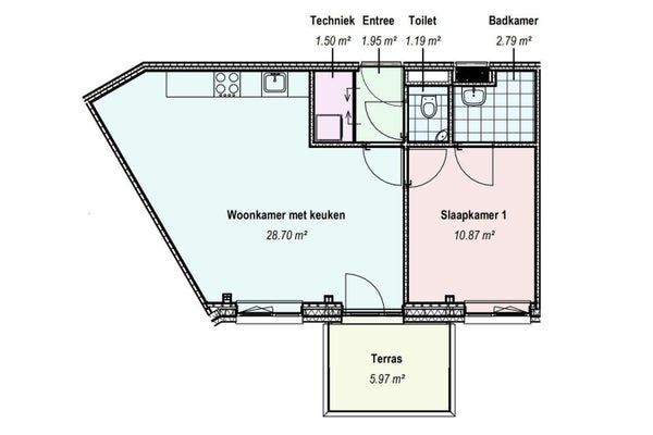 Deze moderne woning is onderdeel van een appartementencomplex aan de Waterstraat, een duurzaam complex met 35 short-stay appartementen. De indeling is ruim en logisch: een hal die toegang biedt tot alle ruimtes, een lichte woonkamer met balkon, een open keuken, aparte slaapkamer, badkamer en extra bergruimte.