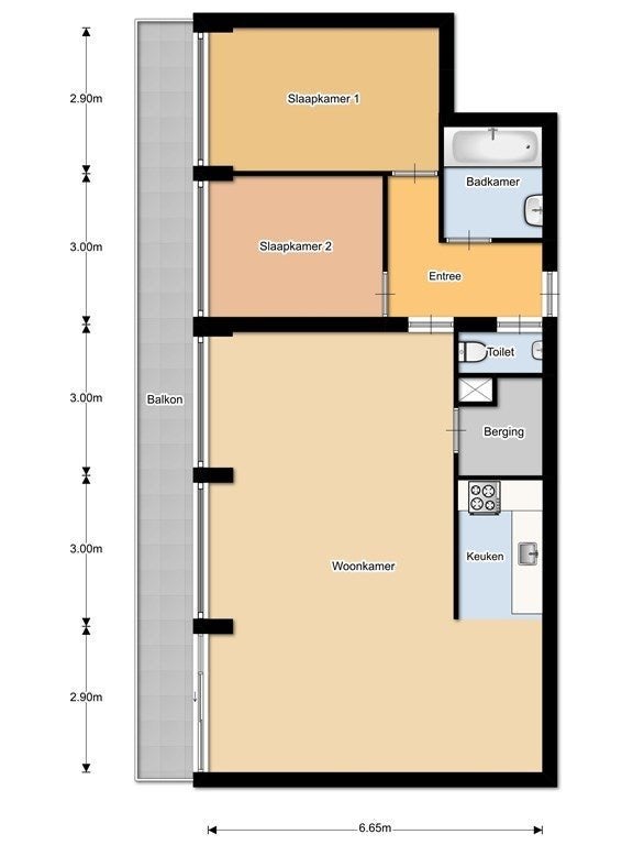 Via de voordeur komt u in de hal van het appartement. Vanuit hier zijn de separate toiletruimte, badkamer en twee slaapkamers toegankelijk. Tevens is de woonkamer vanuit de hal te bereiken. De woonkamer is ruim van opzet en staat in verbinding met de half-open keuken welke is voorzien van een inbouwkeuken met verscheidene inbouwapparatuur.