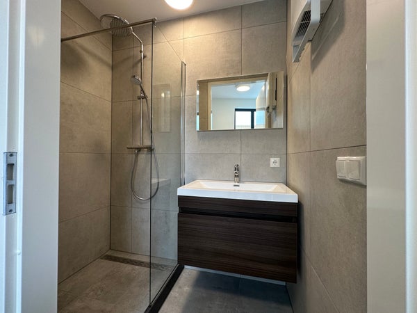 Woonkamer met open moderne keuken welke is voorzien van de volgende inbouwapparatuur: inductie kookplaat, afzuigkap, RVS-spoelbak met mengkraan, vaatwasser, koelkast en combimagnetron. Moderne en luxe badkamer betegeld met lichte vloertegel en donkere marmer look wandtegel, voorzien van inloop douche met regendouche, wastafel met meubel en spiegel, toilet en mechanische ventilatie.
