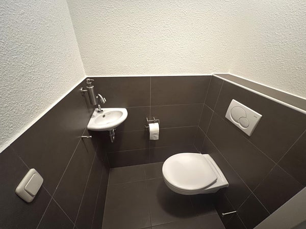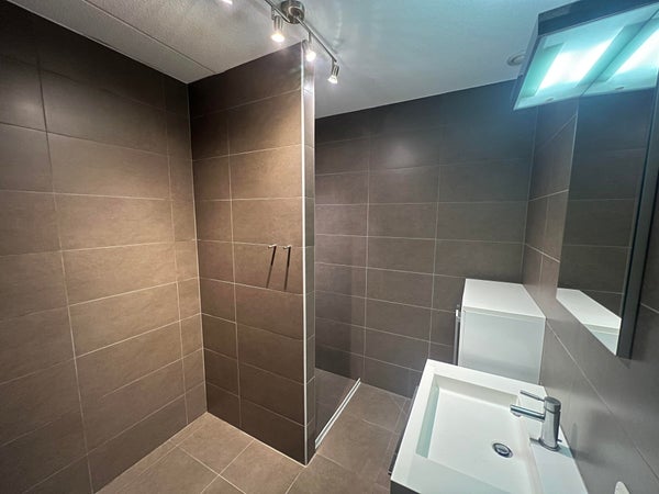 De badkamer is modern en tijdloos, ingericht met een royale inloopdouche, wastafel met meubel, kastruime en een handdoekenradiator. Ook vind je in de hal het toilet, voorzien van een fonteintje.
