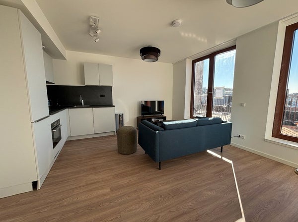 - Een sfeervolle woonkamer met open keuken, voorzien van o.a. een combimagnetron, koelkast en vaatwasser