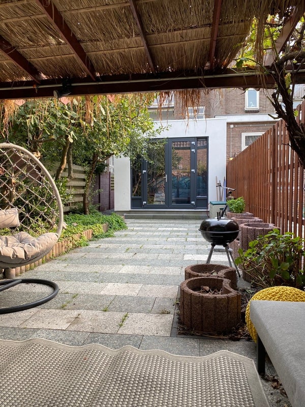 Vanuit de woonkamer bereikt u de gezellige binnenplaats die overloopt in een ruime, betegelde achtertuin met beplanting — een fijne plek om te ontspannen of te genieten van een zomerse barbecue.