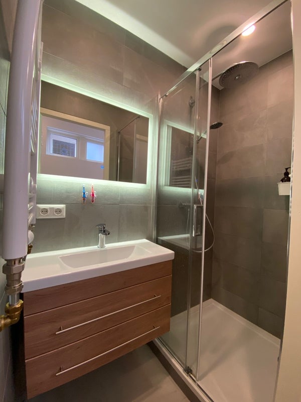 • Badkamer (ca. 1.00 x 2.00) met regendouche, badkamermeubel met verlichte spiegel en elektrische verwarming.