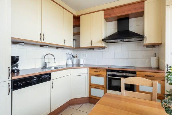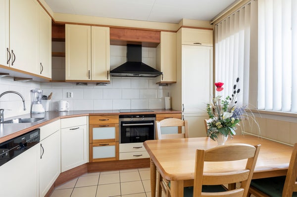 Keuken voorzien van kookplaat, afzuigkap, spoelbak, koelkast, vriezer en vaatwasser.