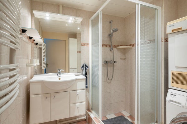 Badkamer met douche, handdoekradiator, wastafel, wasmachine en droger.