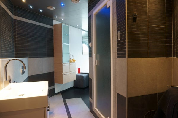Trap naar 1ste etage. Ruime masterbedroom met open badkamer. Deze is voorzien van wastafel en stoomdouche. 2de slaapkamer en aparte inloopkast.