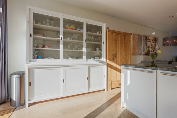 Hal die leidt naar de gang. De ruime woon/eetkamer met open keuken aan de achterzijde gelegen met alle denkbare apparatuur. Aan tuin gelegen hoofd slaapkamer van ca.4m x 4m.