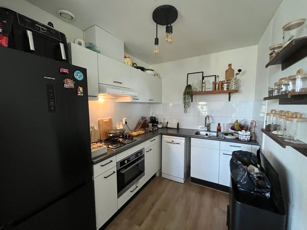Ruime woon/-eetkamer met toegang tot het balkon en uitzicht over de binnentuin en de Vliet. Semi-open keuken met keukenblok en inbouwapparatuur. Berging in de onderbouw.