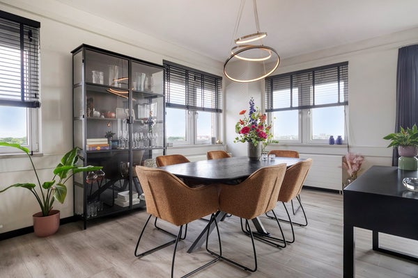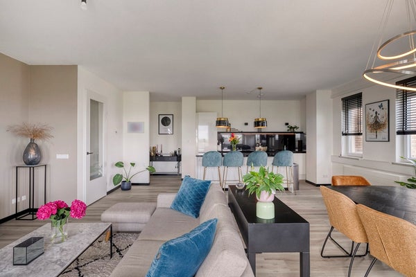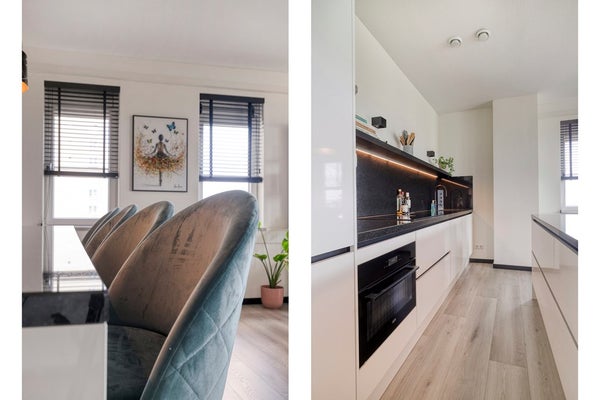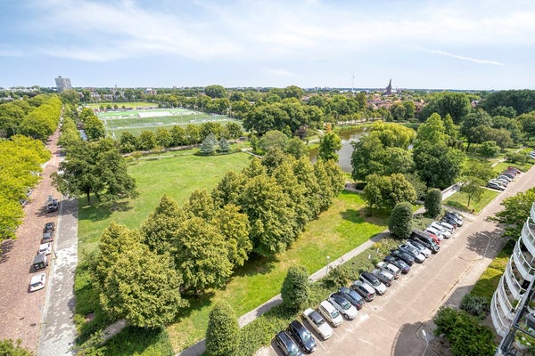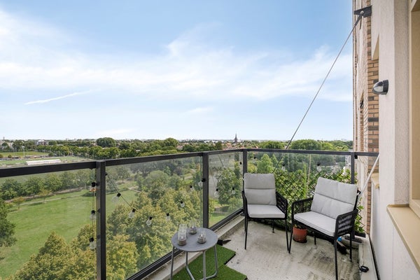 Vanuit de woonkamer leiden dubbele deuren naar het balkon, dat een zonnige plek biedt met vrij uitzicht over het Noteboompark en nabijgelegen sportvelden.