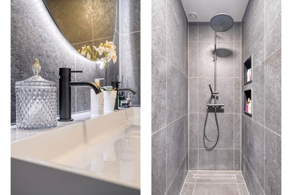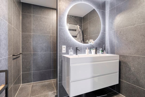 De moderne badkamer is uitgerust met een inloopdouche en een dubbele wastafel.
