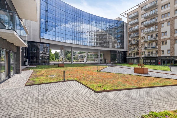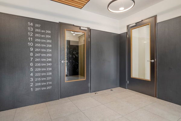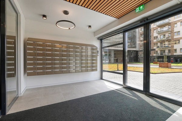 Je komt het goed onderhouden appartementencomplex binnen via een moderne lobby met automatische deuren. De entreehal bevat een video-intercomsysteem. Van hieruit heb je toegang tot de postbussen, de liften en de beveiligde ondergrondse parkeergarage.