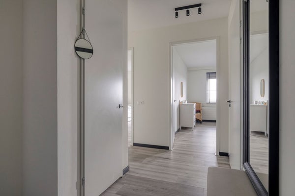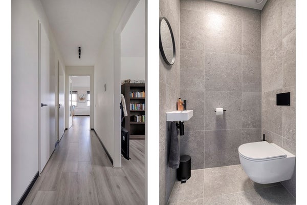 Naast de gang bevindt zich het aparte toilet. Een aparte wasruimte is ook toegankelijk vanuit de hal, met aansluitingen voor een wasmachine en droger.