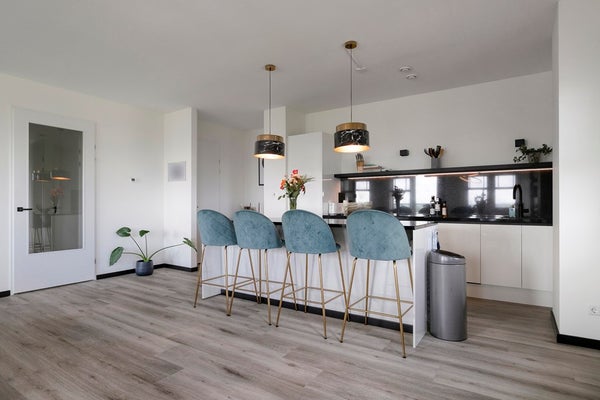 De centrale hal leidt naar de hoofdwoonruimte. De ruime en lichte open woonruimte beschikt over een moderne keuken, uitgerust met hoogwaardige apparatuur, waaronder een koelkast/vriezer combinatie, een combimagnetron, inductiekookplaat met geïntegreerde afzuigkap, een Quooker en een vaatwasser.