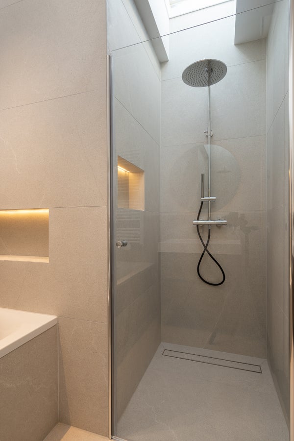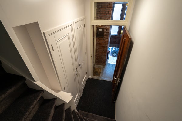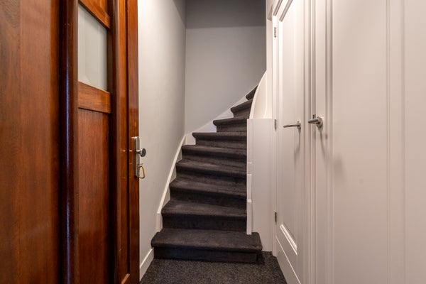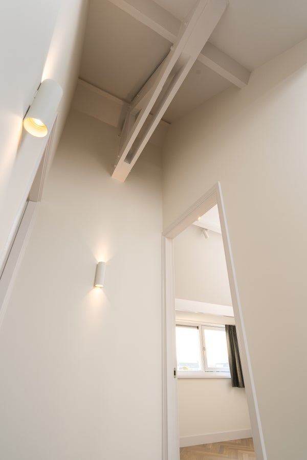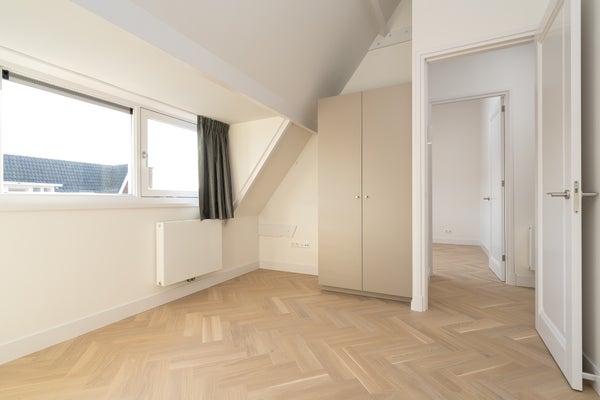 Trap in open portiek naar de eerste verdieping, gemeenschappelijke entree met trap naar de tweede verdieping. Entree van het appartement, trap naar de derde verdieping alwaar de zeer lichte woonkamer met een luxe open keuken met kook(schier)eiland met hoogwaardige inbouwapparatuur (Bora inductiekookplaat met ingebouwde afzuiging, Siemens oven, koelkast, vriezer en vaatwasser) en veel kastruimte. Vanuit de woonkamer is er via de grote raampartij met tweemaal openslaande deuren toegang tot het grote dakterras aan de achterzijde van de woning. Via de woonkamer bereikt u de hal met toegang tot de andere vertrekken: twee slaapkamers, een luxe badkamer, een apart toilet en een inbouwkast met plek voor de wasmachine en wasdroger. De luxe badkamer is voorzien van een ligbad, een ruime douche met regendouche, dubbele wastafel met meubel, verwarmde spiegel en een handdoekradiator. De twee grote slaapkamers aan de voorzijde zijn voorzien van inbouwkasten. De gehele woning is voorzien van inbouwverlichting, jaloezieën en gordijnen.