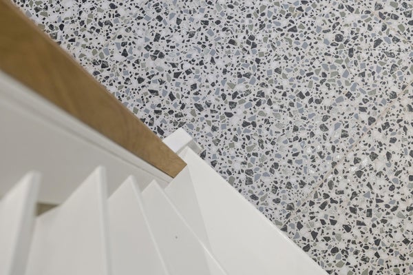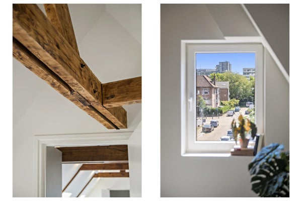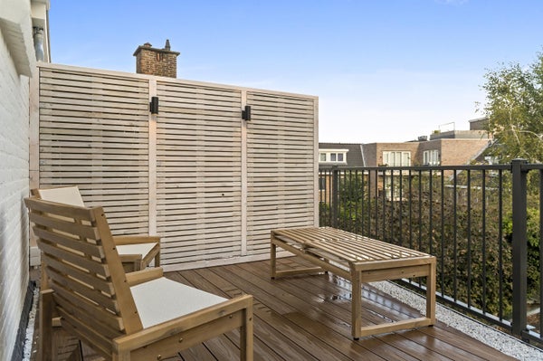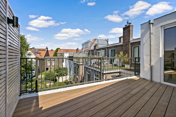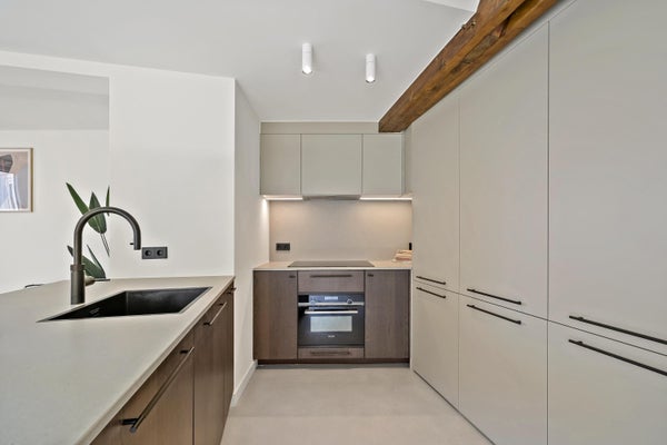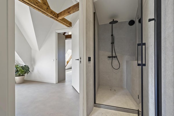De woonkamer is echt een eyecatcher, de balken van de kapconstructie vormen in combinatie met het strakke interieur een mooie mix tussen moderne en de authentieke bouwstijlen. Vanuit de woonkamer is het grote en rustig gelegen terras van 12 m² te bereiken.