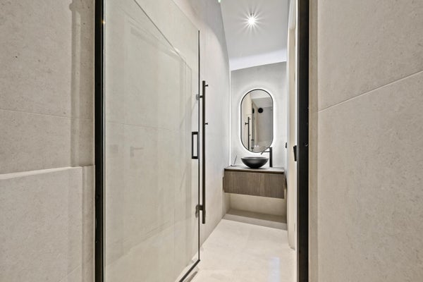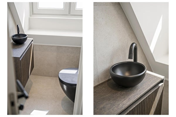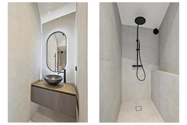 De badkamer is bereikbaar vanuit de slaapkamer en is luxe uitgevoerd met fraai tegelwerk, een inloopdouche, een mooi wastafelmeubel, een verlichte en verwarmbare spiegel en alles is afgewerkt met zwarte kranen en douchegarnituur. In de onderbouw is een eigen berging beschikbaar (hoogte circa 1.72m)
