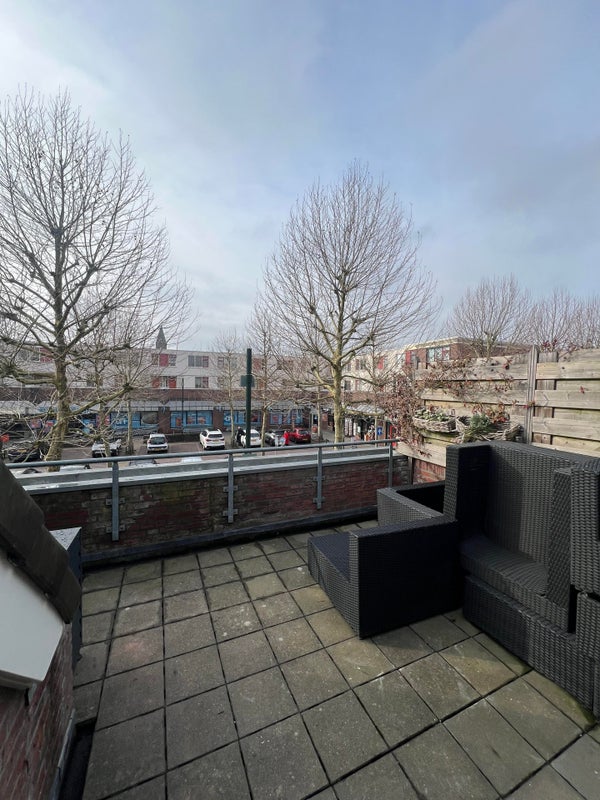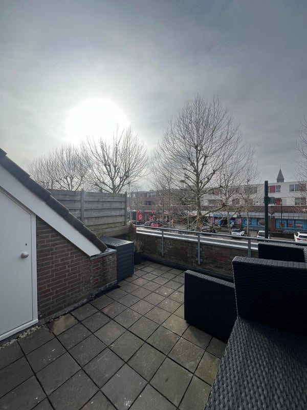 U komt binnen in een ruime hal welke toegang geeft tot een separaat toilet, bergruimte en woonkamer met open keuken en airconditioning. De keuken is voorzien van een oven, magnetron, vaatwasmachine en een 5-pits gas kookplaat. Via de schuifpui heeft u toegang tot het ruime, zonnige dakterras met elektrische zonneluifel.