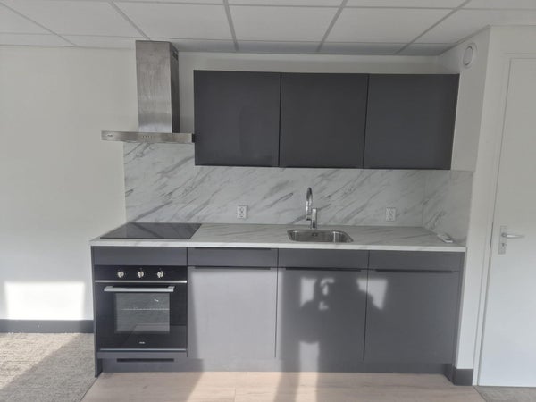 De studio heeft een moderne open keuken voorzien van inbouwapparatuur (afzuigkap, inductiekookplaat, combi-oven, koelkast).