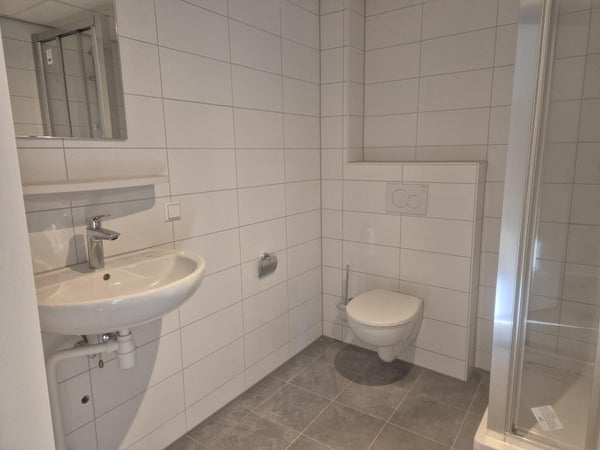 De badkamer is voorzien van douchecabine, wastafel, hangend toilet en een designradiator.