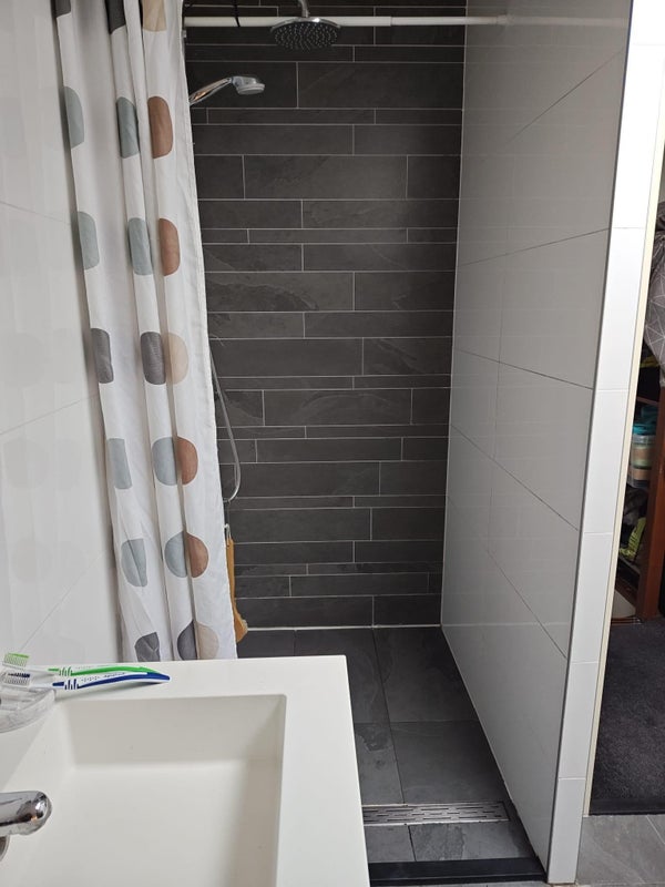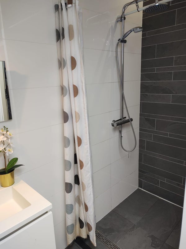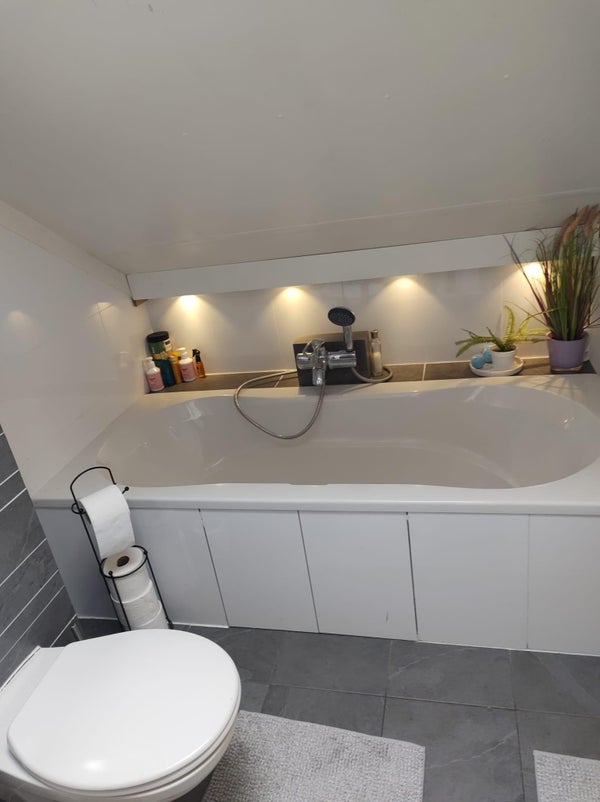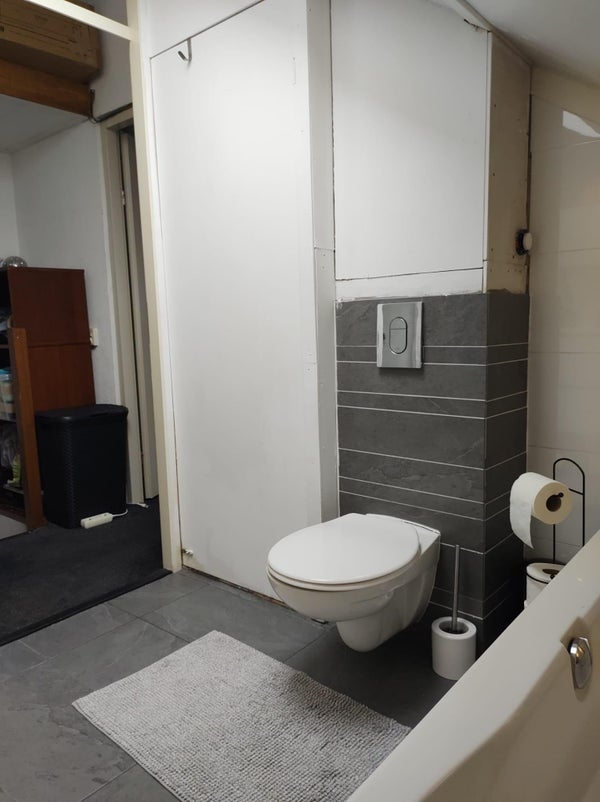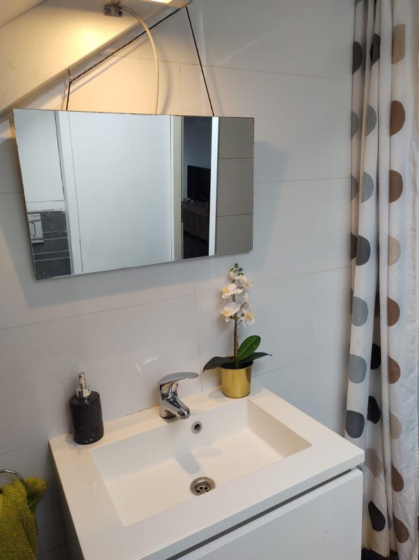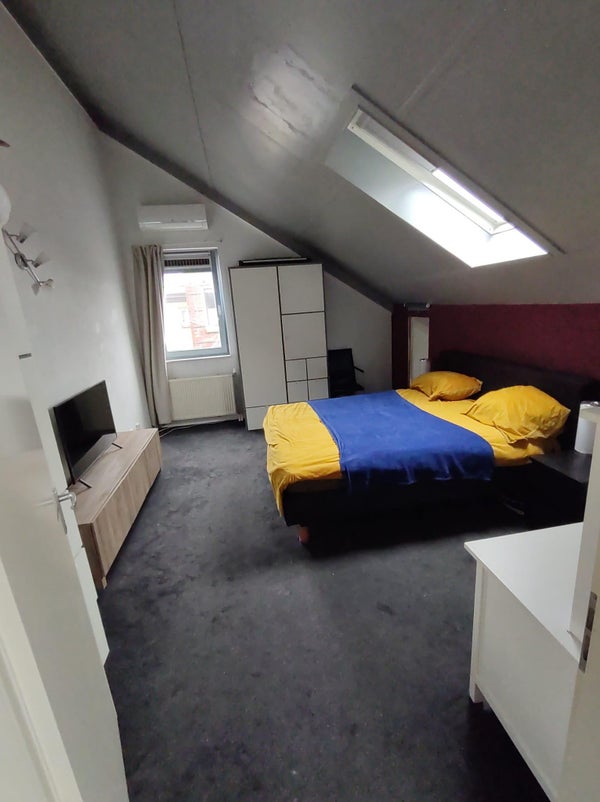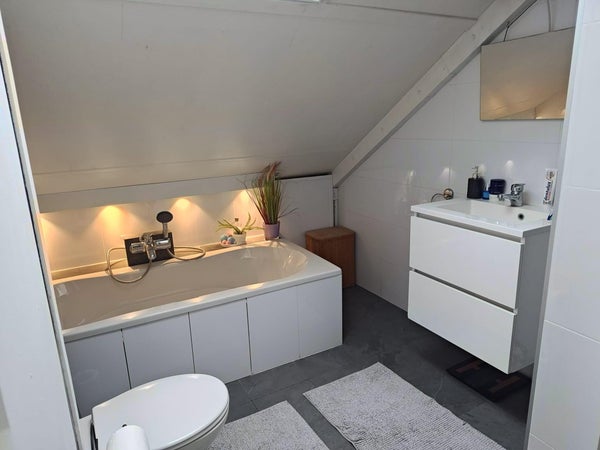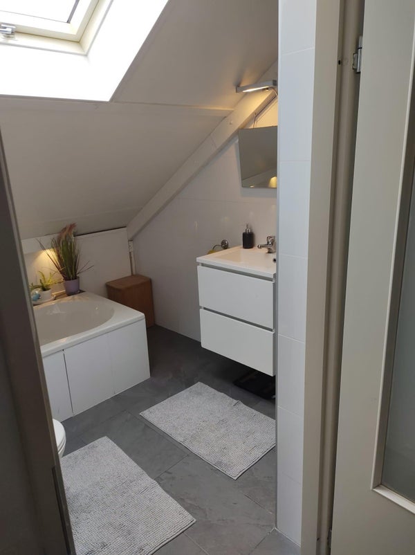 Via vaste trap toegang tot zeer ruime slaapkamer van 19,5m2 voorzien van airconditioning, met aansluitend de badkamer voorzien van ligbad, inloopdouche en tweede (hang)toilet. Badkamer is echt een leuke ruimte door de schuine kap, vloerverwarming, keurige verzorging en sfeerverlichting.