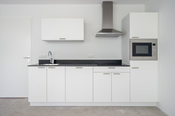 De keuken is voorzien van een composiet werkblad in de kleur zwart, keramische kookplaat, combimagnetron, koelkast en afzuigkap.