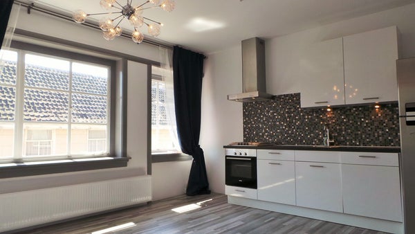 Entree via afgesloten brandpoort naar gezamenlijke portiek. Via het trappenhuis is de 1e verdieping te bereiken. Ruime woonkamer met open keuken en erker met uitzicht op de winkelstraat. De keuken is luxe uitgevoerd met inbouw kookplaat, rvs afzuigkap, oven, koel- vriescombinatie en vaatwasmachine.